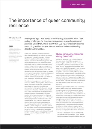 LGBTQIA+ vulnerabilities remain a key challenge for disaster management research, policy and practice. It also takes an opportunity to highlight the capacities and resilience qualities of LGBTQIA+ people and groups.