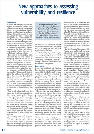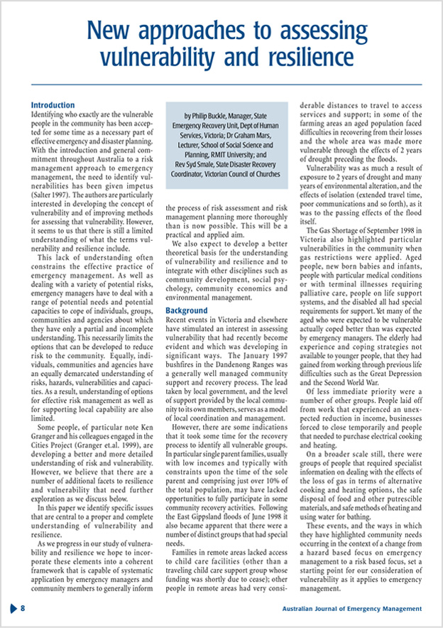 This paper introduced me to disaster resilience. As an environmental scientist, I had been doing river research using the Resilience Alliance body of work about resilience in social-ecological systems. When I started writing and teaching a unit on natural hazards I came to realise, with the help of the definitions and ideas in this paper, that disaster resilience was a divergent social science concept that I should delve into. So, I guess that Buckle et al. seeded an interest that has led to my ongoing learning, teaching, and research in disaster resilience. Perhaps most importantly, the Buckle et al. paper explained the differences and similarities between disaster vulnerability and disaster resilience. That Australian communities may simultaneously be at risk, vulnerable, and have agency and resilience remains one of the most important highlights from this paper for me, and one of the most important practice foundations to disaster preparation, mitigation, response and recovery.