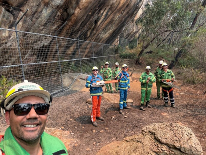 The winning photograph demonstrates disaster resilience through the proactive and culturally informed efforts to protect irreplaceable Aboriginal rock art from bushfire damage. It shows Traditional Owners and representatives from all 3 registered Aboriginal parties working alongside agencies on Country, applying cultural knowledge and rapid response strategies to reduce the impact of fire on significant heritage sites.