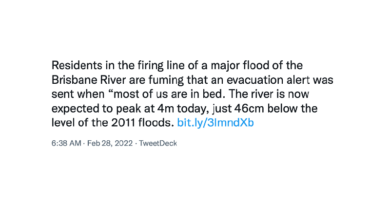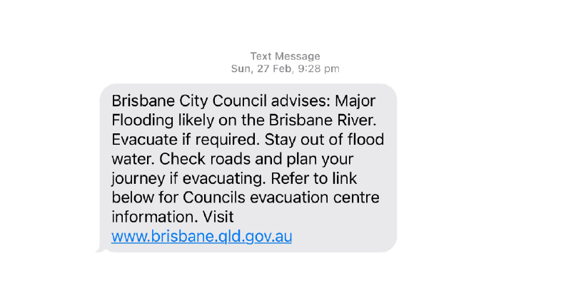 On the morning of 28 February, Brisbane experienced further flooding and residents were alerted or awoken overnight by an evacuation alert issued through the Brisbane City Council text message service (Figure 6).