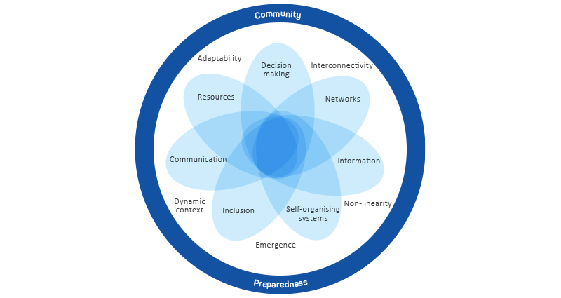 Figure 1 places the 7 dimensions within a complex system and highlights the relationships between the dimensions that are interconnected, non-linear, dynamic, adaptable and emergent. Complexity theory presents an alternative to reductionist approaches that seek to simplify difficult or multi-layered problems (Turner & Baker 2019). It acknowledges and values the messiness and uncertainty that are inherent in social life. Through this lens, it is possible to incorporate the changing, unexpected and only partly knowable characteristics of communities. While the goal of traditional efforts to reduce complex problems into simplified, understandable and quantifiable parts seek to ‘provide us with at least the illusion of control’ (Pycroft 2014) or ‘to facilitate ease of … action’ (Hager & Beckett 2019), complexity theory argues that to do so is inherently ineffective, due to the ongoing influence of excluded elements. The 5 core concepts of complexity theory are particularly helpful to understand community preparedness.