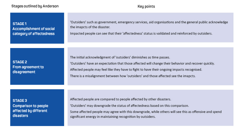 This article draws on a longer paper published by Brady, Gibbs and Harms (2021).1 In that study, participants mentioned comparing their experiences to others who had been affected by the same disaster to figure out where they should be in their recovery. Participants also indicated they felt judgement about how badly they had been affected compared to others. The findings from this study were used to adapt an existing model of hierarchies of affectedness. It is important to understand how hierarchies of affectedness are formed, how they can be used and how negative consequences can be reduced because of how they affect people and communities.