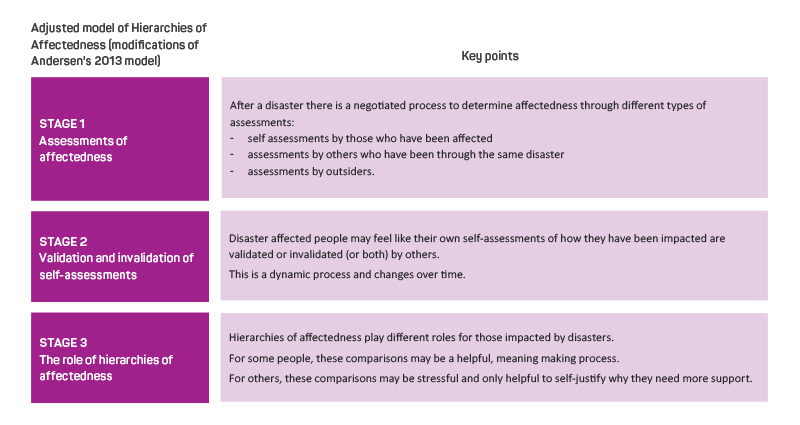 A hierarchy of affectedness emerges when the level or type of disaster experienced by an individual, family or community is compared to others in the same or different events (Andersen 20132). Examples of where these formal hierarchies develop include the creation of eligibility criteria for accessing financial assistance (such as grants) and other forms of aid after events. Hierarchies of affectedness are not commonly referred to in emergency and disaster policy and doctrine. Nonetheless, both explicit and implicit hierarchies are formed after such events to determine who are the most and least affected.