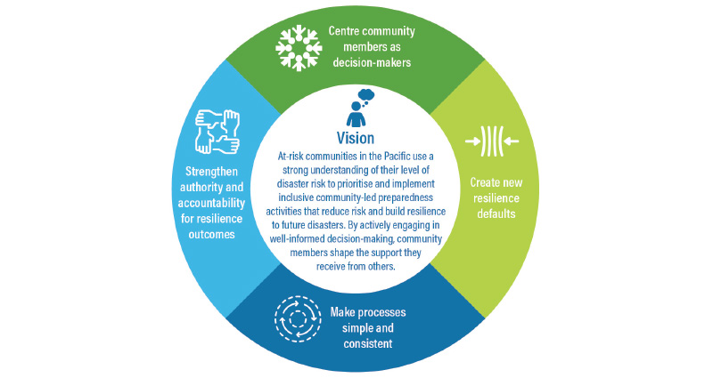 The Pacific is one of the world’s leading regions in progress towards advancing integration between DRR and CCA action, seen with the design of frameworks that codify strategic guidance to better inform climate-sensitive disaster preparedness programming. Most notably, the Framework for Resilient Development in the Pacific (FRDP), endorsed at the Pacific Island Forum in 2016, is the first regional framework designed to mitigate vulnerability to climate and disaster risk and emphasises the importance of community-based approaches to building resilience.9 Despite this, the FRDP does not emphasise clear guidelines around who is accountable for strengthening community leadership, while its goals are posited as voluntary guiding principles rather than a set of objectives for stakeholders to commit to, raising challenges towards establishing grounded and consistent shared outcomes for the Pacific.