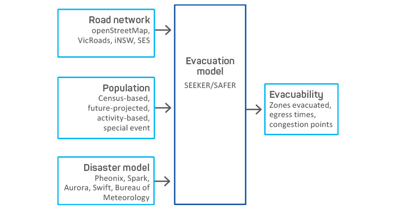 A conceptual model for SEEKER and SAFER is given in Figure 2. These models take as input a baseline representation of the population in the region, its key roads and an estimate of the fire progression, to simulate community response and likely consequences. Underlying SEEKER is a data-driven human behaviour model that captures who is in the region (residents, visitors, etc.) and where (at home/work/shops or travelling to destinations), and how they will respond to the bushfire threat (go home, check on dependents, wait and see, leave) (Singh et al. 2021).