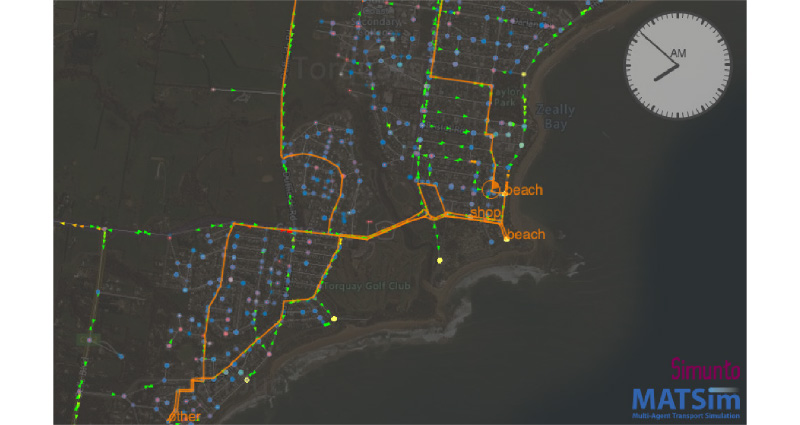 Figure 4: Zoomed view of the output synthetic population showing the town of Torquay. An example synthetic resident's activities and travel legs are highlighted (orange).