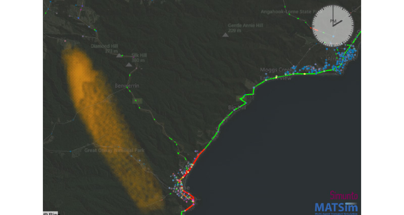 When first presented with the modelled scenarios, the IMT consulted SEEKER’s outputs to make decisions about evacuating Lorne, the township nearest to fire ignition. A few hours later, the incident controller referred to the outputs again to decide whether to evacuate the townships of Airey’s Inlet and Anglesea as the fire rapidly progressed towards them. SEEKER’s video-based outputs (Figure 6), showing a bird’s eye view of the traffic, were used more frequently during this exercise than the web-based tool (Figure 5) that provided aggregated information on estimated numbers of people in various zones. These preferences highlight areas of interest for future study. SEEKER’s video results were also used to prioritise traffic management points given limited resources available on the day with the mobilising agency.