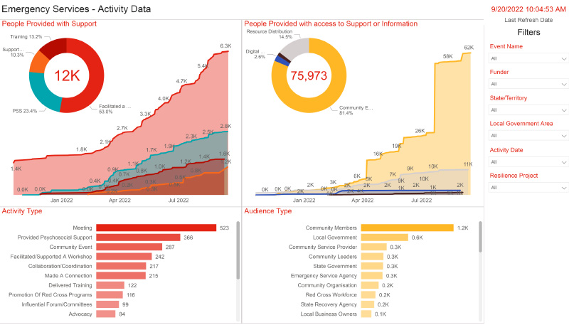 Using the lessons and techniques learnt throughout the 2019–20 bushfire recovery program, we went through a 6 month review process of our data collection tools and visual applications. This review considered the possibility of extending digital reporting across all emergency services within Red Cross. After a collaborative and informative review, the data collection tool was changed from Fulcrum to Kobo Toolbox and dashboards from Tableau to PowerBi. Both changes have been positive from an end-user perspective and in terms of accessibility across the program. In addition to displaying the quantitative data, through PowerBi we used Kobo Toolbox to collect our qualitative data and display the themes on dashboards. This meant teams have narrative available to them instantly and are not reliant on others to manually analyse the qualitative data before producing reports. We continue to produce the monthly community sentiment reports for personnel and external stakeholders to use for program planning and advocacy, but we have reduced the burden of analysis by 80% by streamlining the way data are collected and visualised.