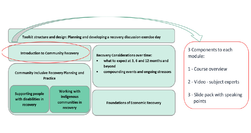 A focus of the program is achieving greater engagement, partnership and collaboration between the emergency management sector and local community services organisations and businesses in recovery. The toolkit is a suite of modules on a range of considerations that exercise planners can include in a recovery exercise day. The modules were designed at an ‘exposure/introductory level’ aimed to increase the understanding of participants of recovery topics and encourage further planning and action. Each module was developed with the contribution of subject-matter experts and based on research and practice and includes recovery resources.
