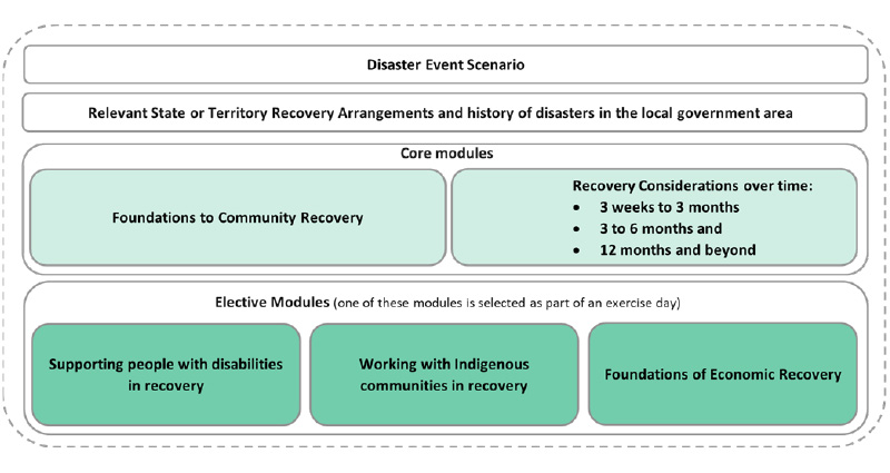 The Recovery Exercising Toolkit (Figure 1) is a national resource that supports recovery planning and capability development through exercising at the regional and local emergency management levels. It also supports emergency management committees, local councils and other groups through evidence-based guidance and a set of specialised resources to enable emergency planners to follow a pathway in a recovery discussion exercise.