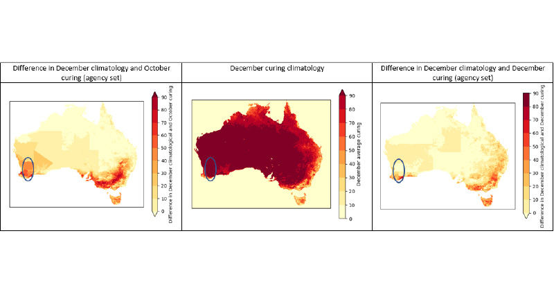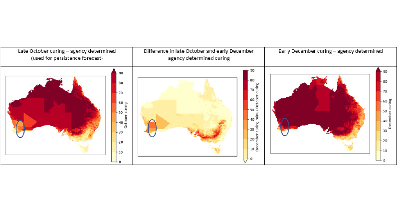 Early in the trial, the ‘persistence’ method was used – where the current observed curing value is used for the outlook period, as is done for short-term forecasts. This is a suitable solution for the short-term as there is usually little change in the curing data in that period. However, the persistence method does not capture any changes to curing over longer periods. This is particularly important leading into the fire season. It was apparent during the 2021–22 southern fire season that this approach was insufficient.