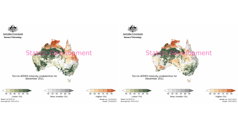 The forecast issued in late October showed a high chance of lower-than-average AFDRS intensity for December in the circled region. One month later, the outlook showed a chance of higher-than-average AFDRS intensity. The October curing resulted in a significantly lower estimation of the December averaged intensity than expected, given the atmospheric inputs. The devastating Wooroloo fire in southwest Western Australia started around 6 weeks after the October issued forecast.3 This had significant operational implications of underestimating the fire intensity and a possible lack of preparedness. Finding an appropriate value for curing was identified as an area for significant improvement.