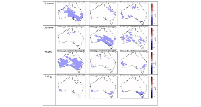 La Niña events are generally associated with lower-than-average temperatures in the mid-latitudes and above-average rainfall in eastern, central and northern Australia (Bureau of Meteorology, 2022). The observed trends of climate change include increasing temperatures across Australia and decreasing rainfall across southern parts during April to October (Bureau of Meteorology and CSIRO 2020) as can be seen in figure 4. In broad terms, the influence of a La Niña could be seen to counteract the climate change trends (within a very short timeframe). We investigated if these opposing influences manifest as significant differences in the hindcasts, initially focusing on temperature.