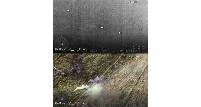 A safe, cost-effective and realistic way of replicating an unplanned fire ignition has also been identified to enable a more extensive evaluation, especially under fire weather conditions unsuitable for experimental ignitions. So far, we have successfully replicated a small fire using an artificial smoke machine (Figure 4). Smoke from this machine was identified via a fire tower operator, a fire observer monitoring a fire tower camera and imagery captured by the drone.