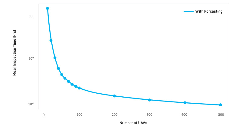 Figure 3: Mean inspection time for different sizes of the UAV swarm used to inspect the lightning strikes.
