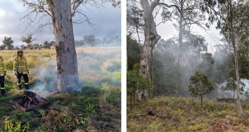 Figure 4. Small fire lighted by members of the ACT Rivers fire brigade (left). Smoke produced by the smoke machine (right).