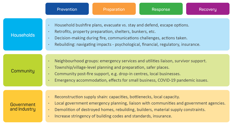 We were interested to explore bushfire risk prevention, preparation, response and recovery approaches and activities in relation to the 3 societal levels as shown in Figure 1 (i.e. ‘Households’, ‘Community’, and ‘Government and Industry’). Some of the specific issues covered in the study included: