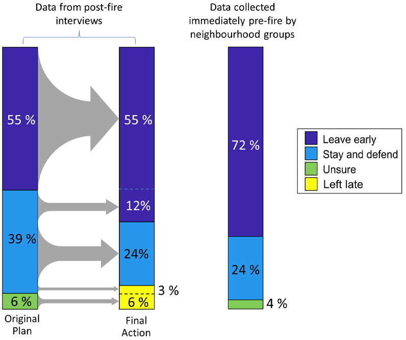 All 33 households that were interviewed in this case study had established some form of bushfire survival plan prior to the Currowan fire, although they varied widely from unwritten vague intentions through to well-documented plans addressing multiple scenarios. The 55% of households that originally intended to evacuate prior to the fire did so, typically some days in advance. A smaller proportion (39% of interviewees) planned to stay and defend, but about one third of these changed their plan in the weeks preceding the Currowan bushfire and eventually evacuated early because the perception of abnormally severe risks. Data collected by neighbourhood coordinators immediately before the fire aligned closely with that gleaned from the interviews. Figure 2 shows the reported original stay-or-leave intentions of interviewees (n=33) and their actual actions prior to the fire. The right column shows data provided by residents (n=401) to Group Coordinators prior to the Currowan fire.