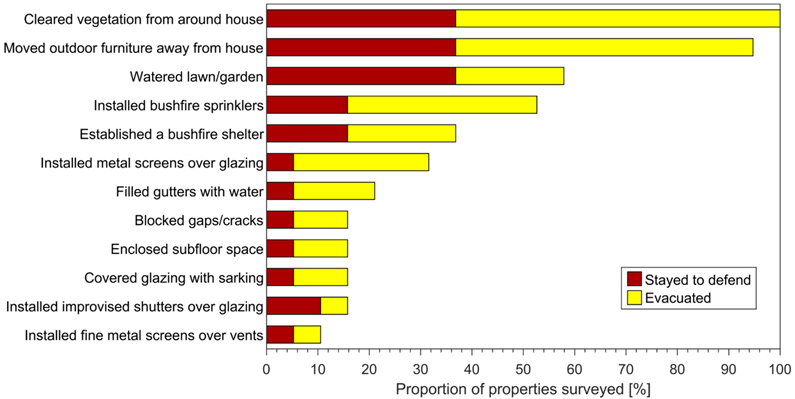 Many residents recognised the elevated level of danger early in the fire season as the Currowan fire grew in the south through November and December 2019. This forewarning allowed residents to make plans, clear vegetation and retrofit buildings. Many of the residents interviewed undertook substantial works on their properties in the weeks leading up to the arrival of the fire. Details of the types of preparations and retrofits undertaken are summarised in Figure 3. All of the assessed householders had prepared the area surrounding their houses (e.g. by clearing vegetation, watering and moving outdoor furniture), whereas a smaller group (35%) undertook more extensive retrofit works on their homes and other buildings.