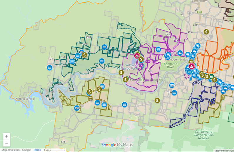 Resilient KV is continuing to develop a Kangaroo Valley Bushfire Preparedness Map. This was initially developed by a small group of KVCBC and community members using Google Maps as the primary source of geospatial information, with community members providing local information data layers such as hydrants, static water supplies, community assets and risks (Figure 4). This initiative has parallels with bushfire preparedness ‘participatory mapping’ activities documented by Haworth et al. (2016).