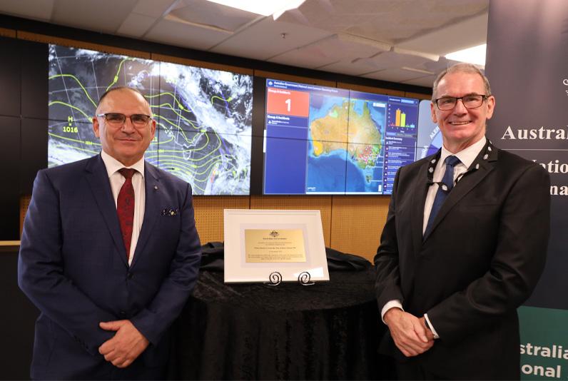 Deputy Coordinator-General, Emergency Management and Response, Joe Buffone AM and Coordinator-General Brendan Moon in the National Situation Room, Canberra.