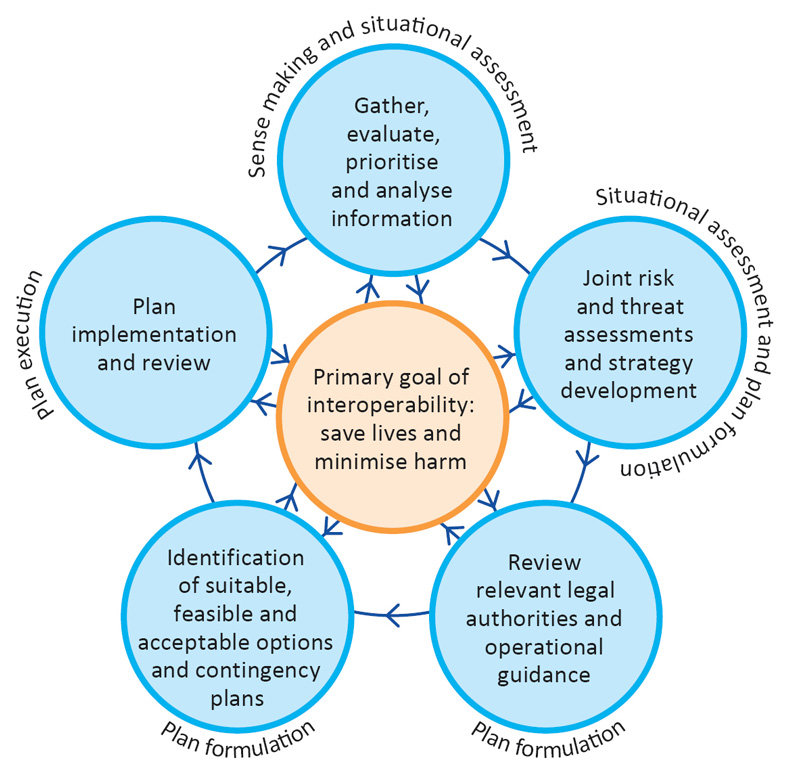 In response to the problems of interoperability, the Government of the United Kingdom established the Joint Emergency Services Interoperability Programme, which developed a doctrine and a framework for joint working between the UK emergency services and other organisations supporting them such as local councils (JESIP 2013; JESIP 2016; 2021). To enhance interoperability, the doctrine introduced a set of principles to be adopted by all organisations involved in a major incident response. For example, to co-locate as soon as practicable and to establish shared situational awareness. The latter is to be achieved with the aid of an analytical Joint Decision Model (see Figure 2). An interoperability framework is also available in Australia; the Australasian Inter-service Incident Management System (AFAC 2017), based on 3 key principles, functional management, span of control and unity of command.