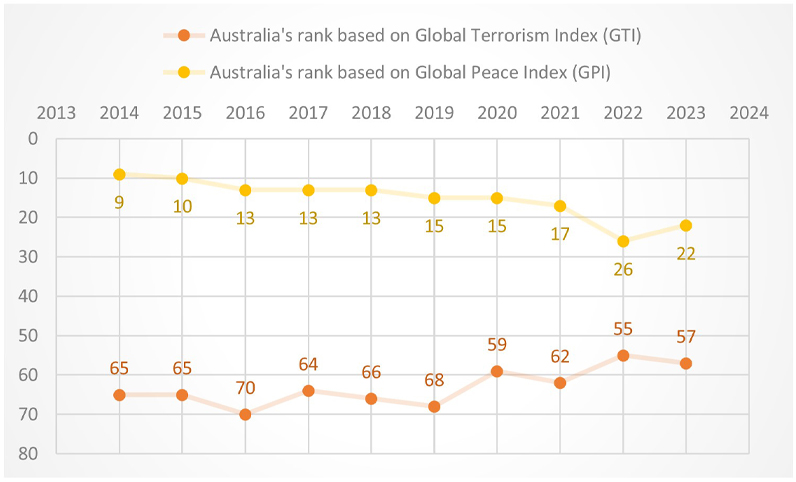 Figure 1: Australia’s changing GPI and GTI rankings in the world between 2014 and 2023.