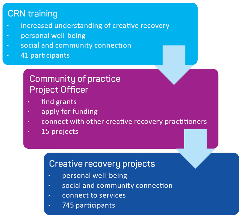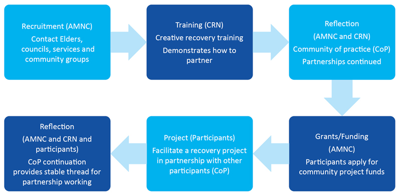 The main outcomes were a direct result of the collaborative approach taken by AMNC and Creative Recovery Network that focused on what the communities needed. The ethos of both organisations allowed for a smooth partnership that was able to grow according to the community needs raised during the training. Figure 3 shows the flow of the process.