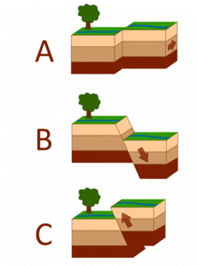 Tectonic plates moving under pressure - a) strike-slip b) megathrust c) reverse thrust